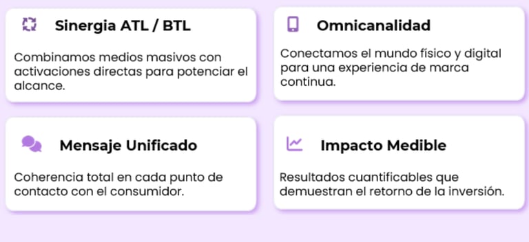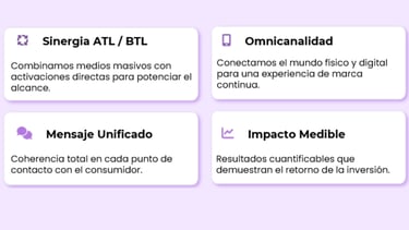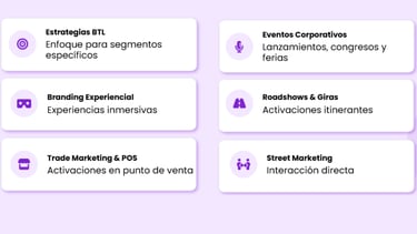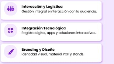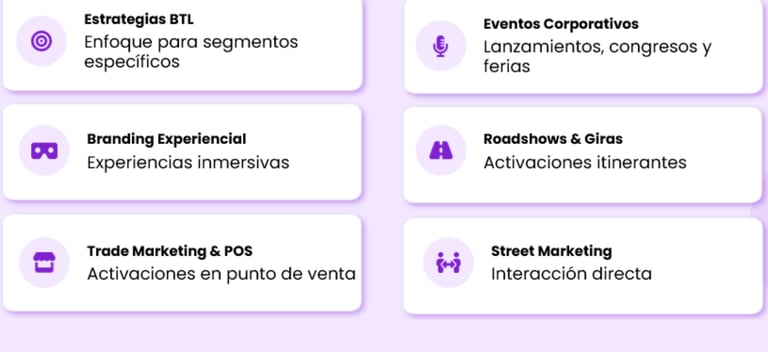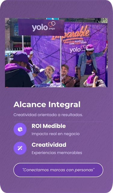 Creamos experiencias de marca memorables que conectan con el público de forma directa y medible. Combinamos creatividad, tecnología y ejecución en campo para activaciones BTL, eventos corporativos y branding, integrando herramientas digitales que potencian la visibilidad, el engagement y el retorno de inversión.